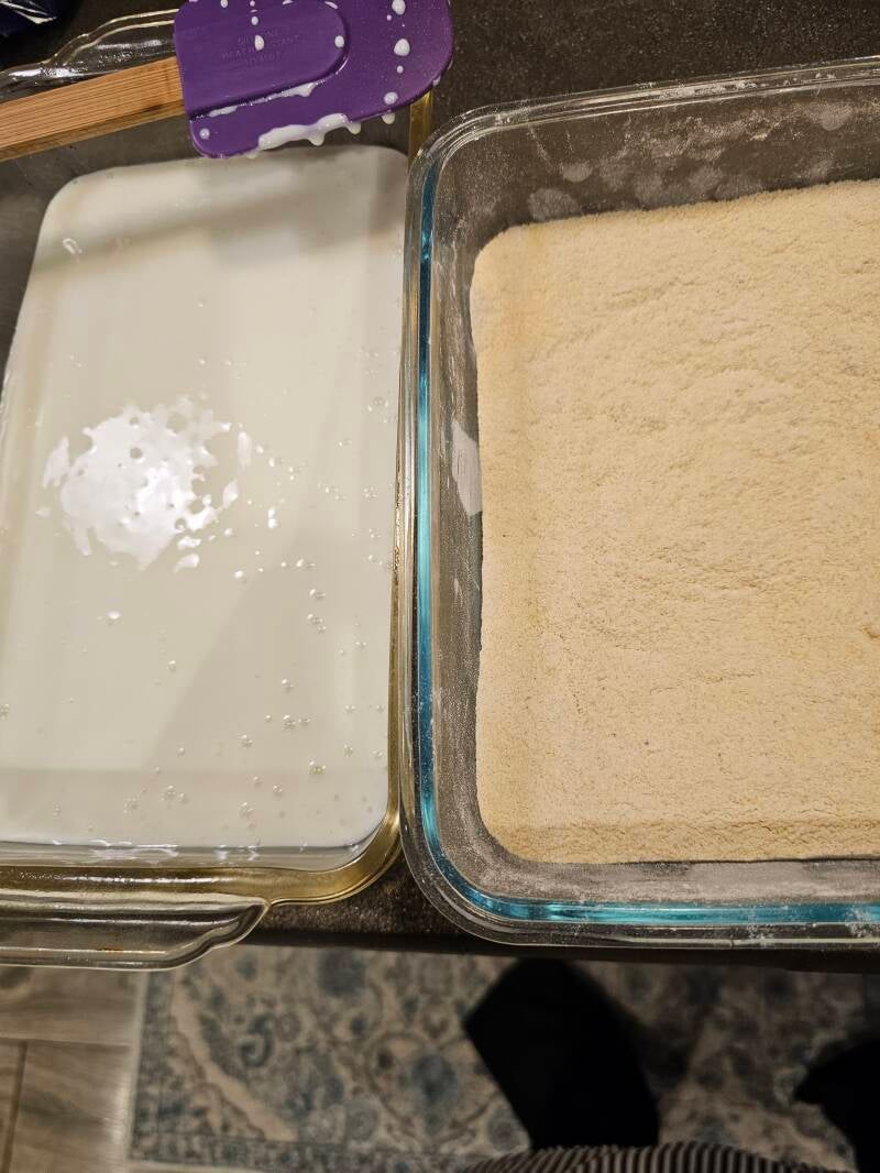 3. In a shallow bowl, pour 1 cup of the buttermilk.